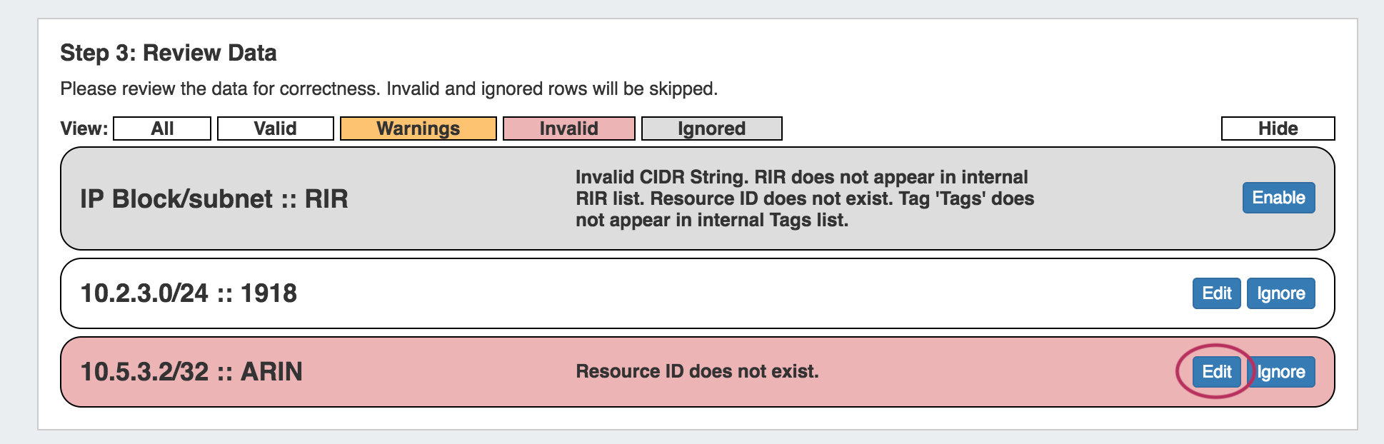 If warnings or invalid entries are found, you may edit the data by clicking the "Edit" button.