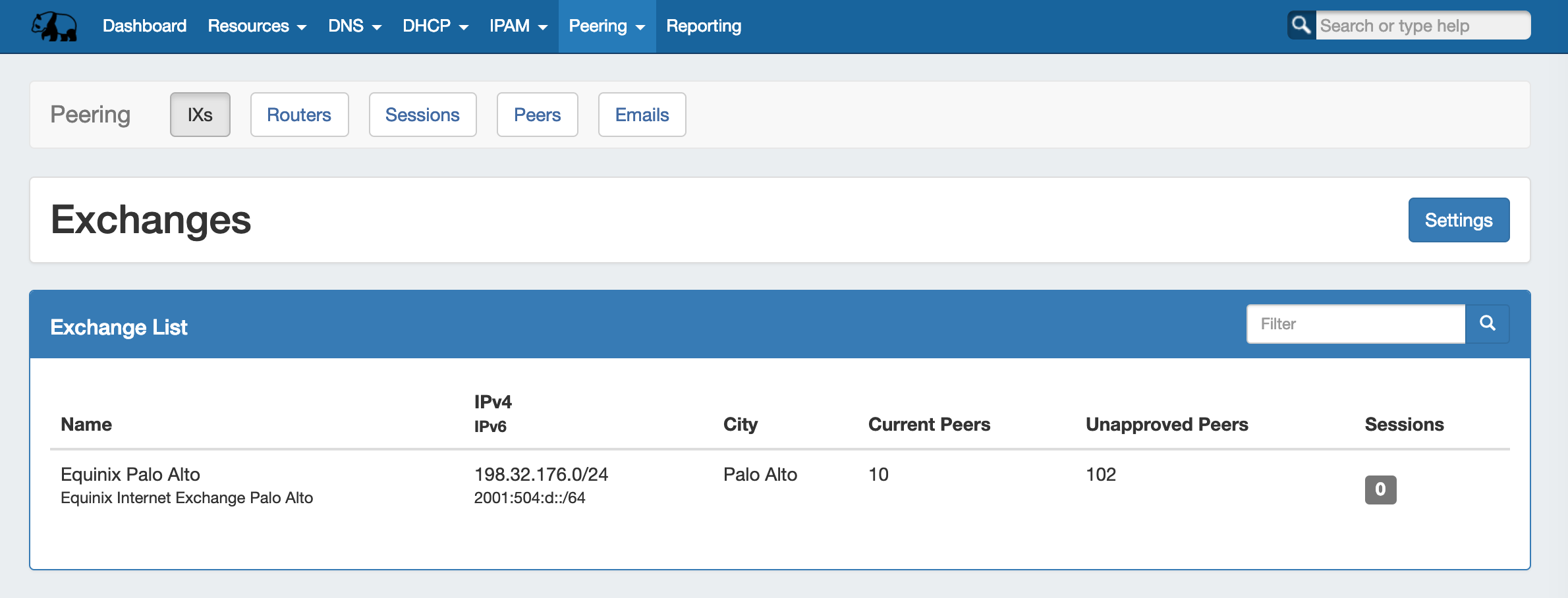 The IXs tab shows the exchange list. From here, you can edit exchange settings and view, manage, and mark peer status and communications via the exchange details page.