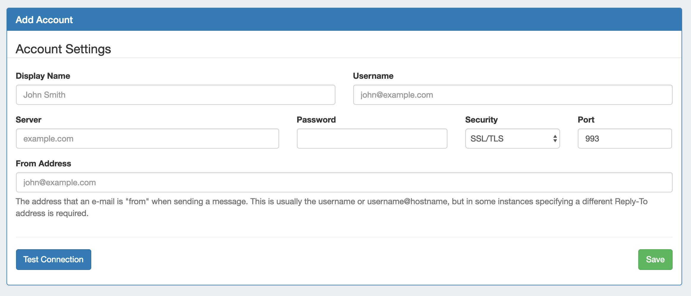 When done, you can verify the information is correct by clicking "Test Connection" - if the account is valid and a connection succeeds, you will see a "Online" response.