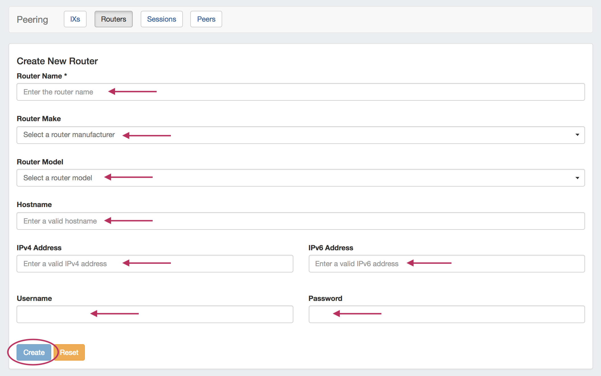 Enter in router details: Name, Make, Model, Hostname, IP address(es), and credentials. When done, click "Create".