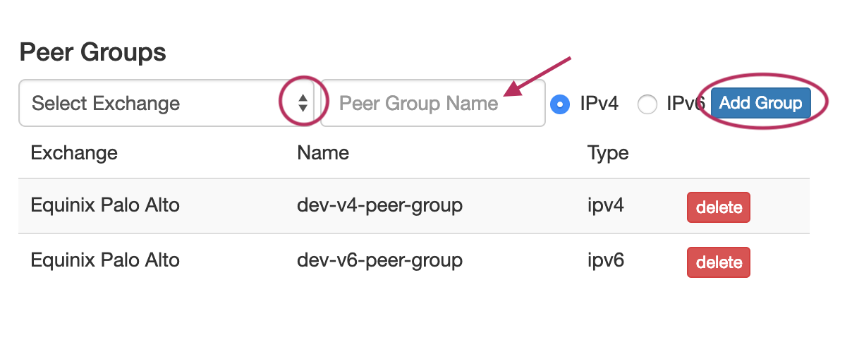 You may also add and delete and Peer Groups associated with the router - select the Exchange, Add the Peer Group Name, select the IP type, and click "Add Group".