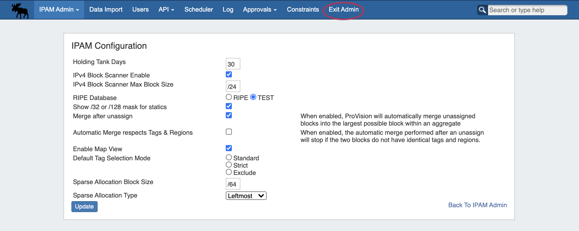 To leave the Admin area, simply click the "Exit Admin" link in the navigation bar. You will be redirected to the Dashboard.