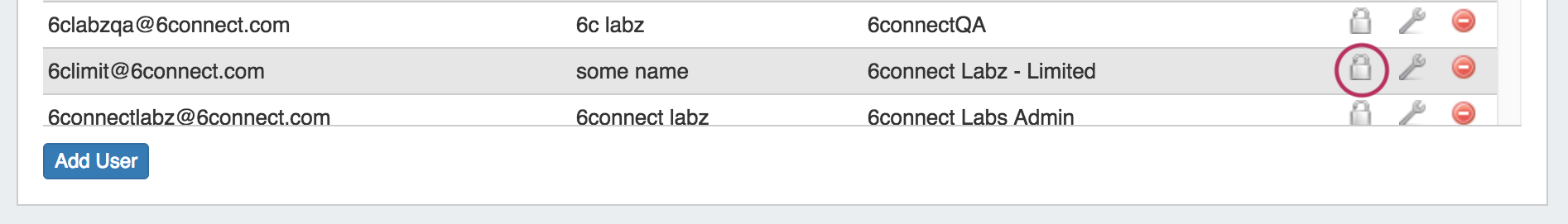 To remove a user from the Users list, click on the red circle "delete" icon next to that user.