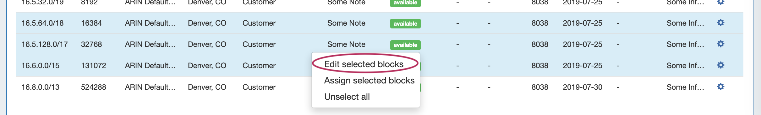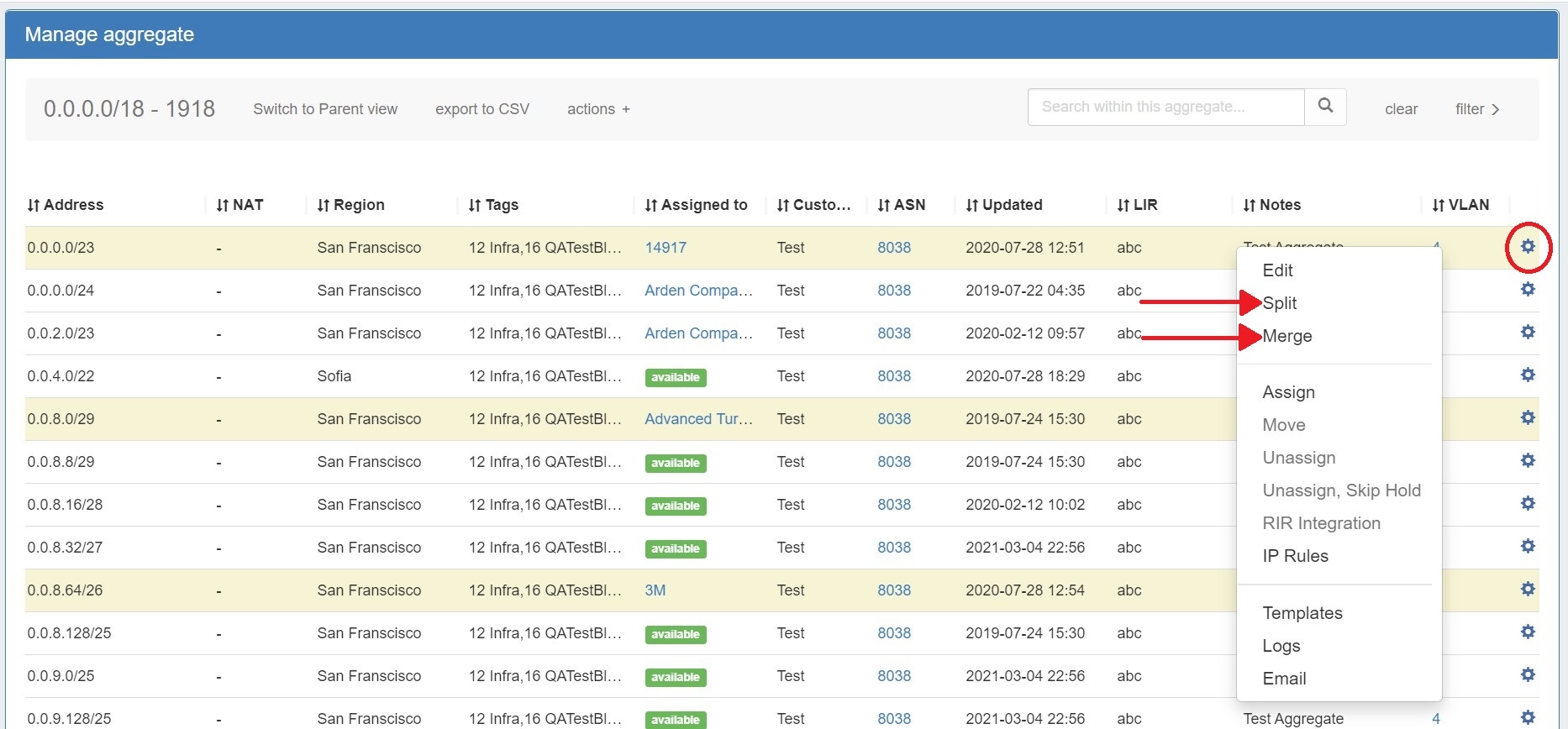• Merge: The opposite of Split. Merge combines two blocks of equal size into the next largest mask, e.g., two /25s will be merged into one /24. Merge is only available for adjacent blocks of the same size that are "Available", in "Holding", or is subassignable.