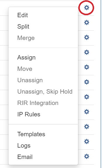 Most actions performed with block managed are contained under the IPAM Manage - Action Menu. Open the Action Menu by left clicking on the Gear Icon, or right clicking anywhere on the block's row. The same Action Menu is also available to manage blocks via the IPAM Gadget.