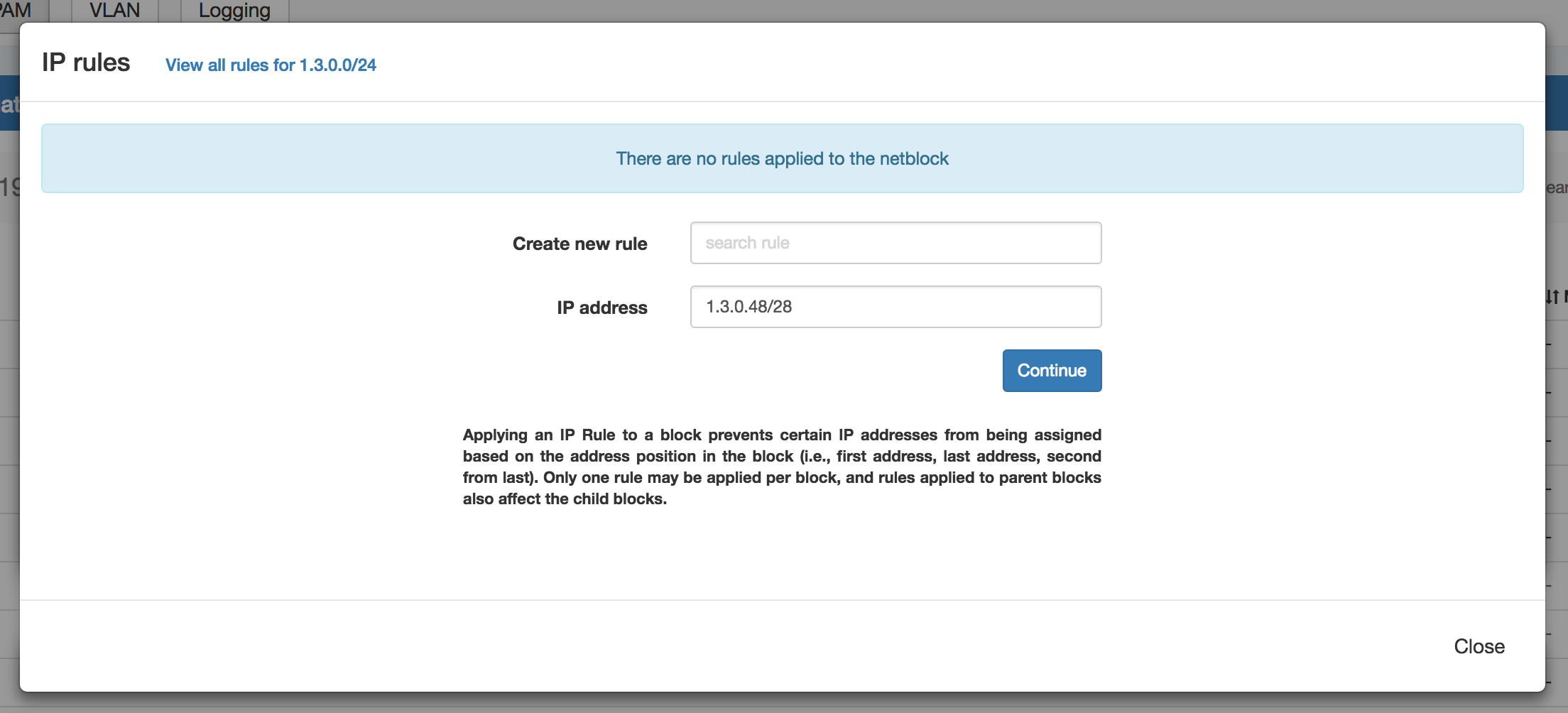 The IP Rules screen will pop up. From here, you can view existing rules applied to the block (or the parent block), search for and apply an existing rule, or create a new IP Rule.