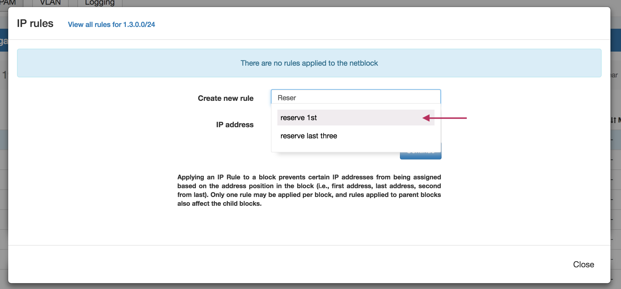 IP Rules allow users to exclude IP addresses from being assigned (via Smart Assign or Direct Assign) based on the address position in the block (i.e., first address, last address, nth from last).