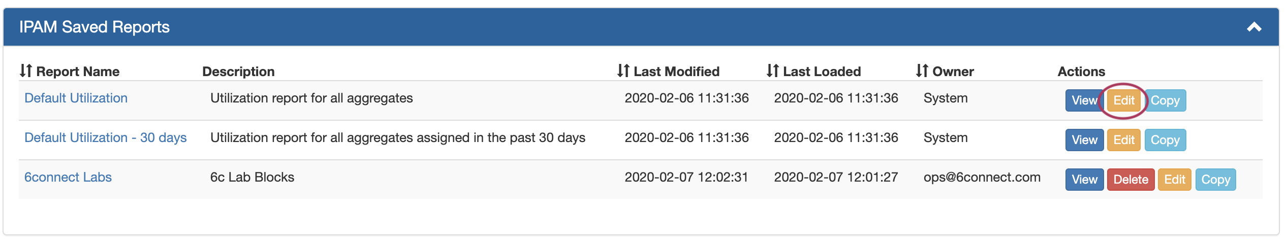 • Edit a report's name, description, or scheduled report settings by clicking Edit, under Actions. (opens Report View → Actions)