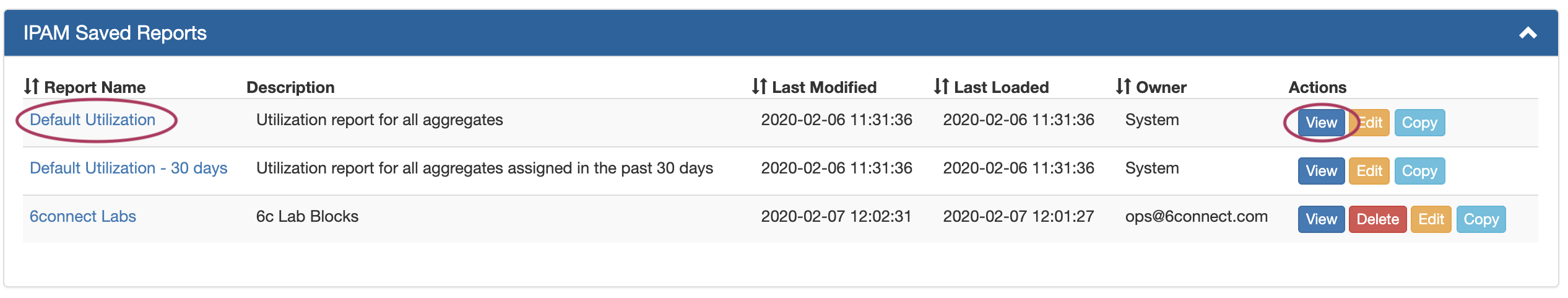 • Open a report by clicking on the report name link, or click View under Actions (opens Report View)