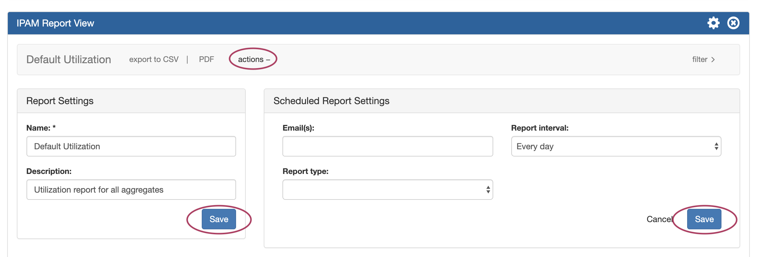 To add Scheduled Report Settings, enter the email address that the report should be sent to, select an interval frequency for how often the report export should be emailed, and (if available) select the report export type to send. When done, click Save. To close the actions panel, click Actions .