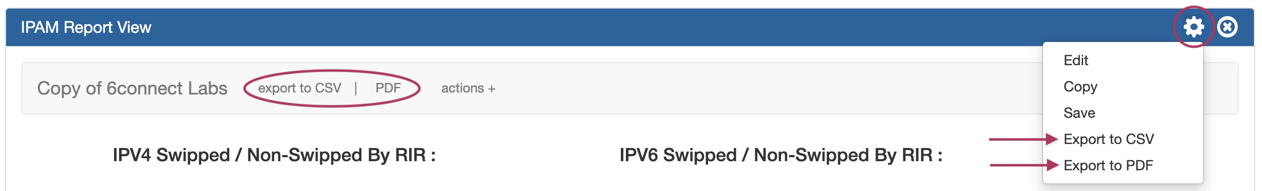• Report view menu (gear icon) with options to Edit, Copy, Save, Export to CSV, and Export to PDF (if available)