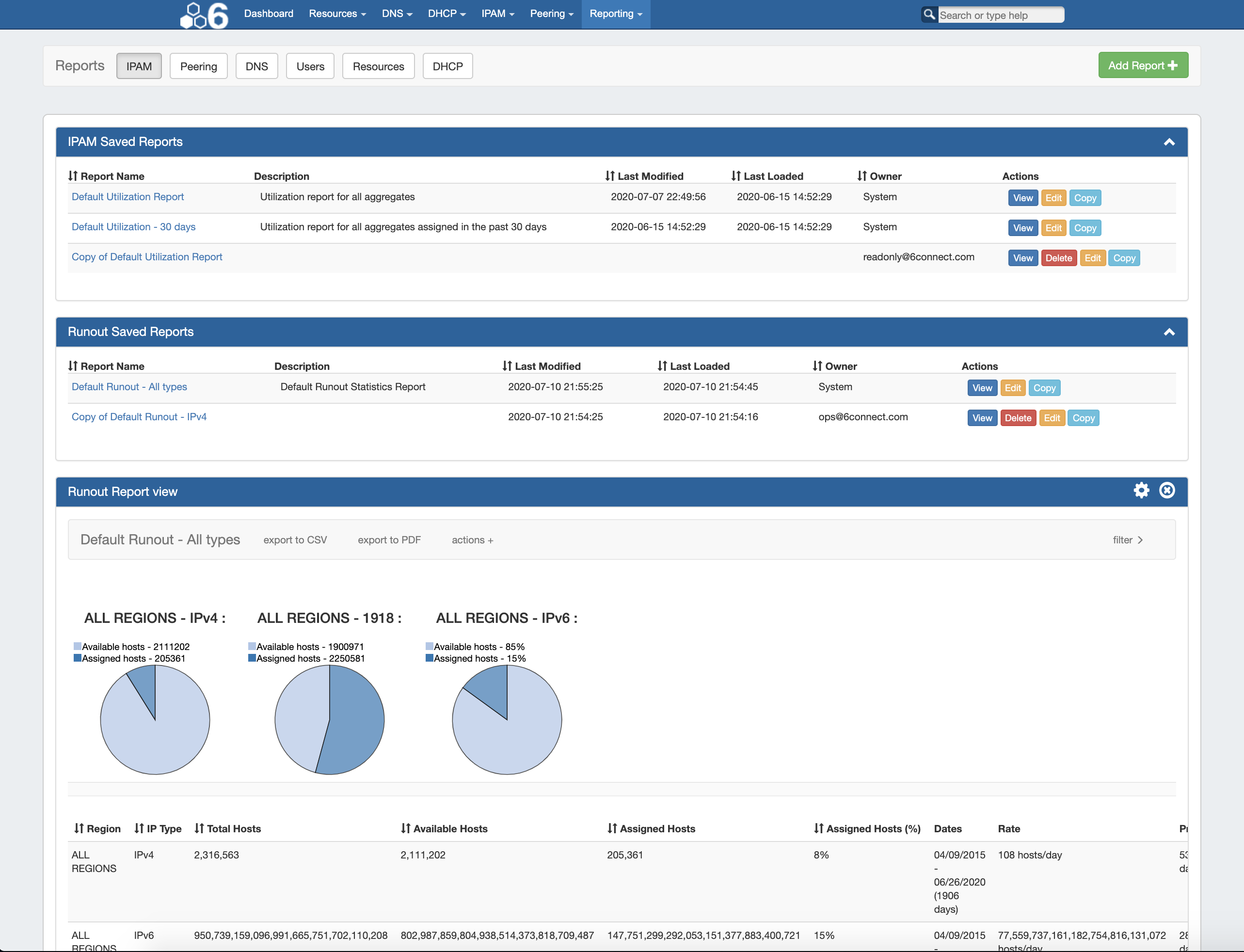 • IPAM Utilizations report - displays IPv4/IPv6 Swipped and Non-Swipped by RIR bar charts, with host utilization tables
