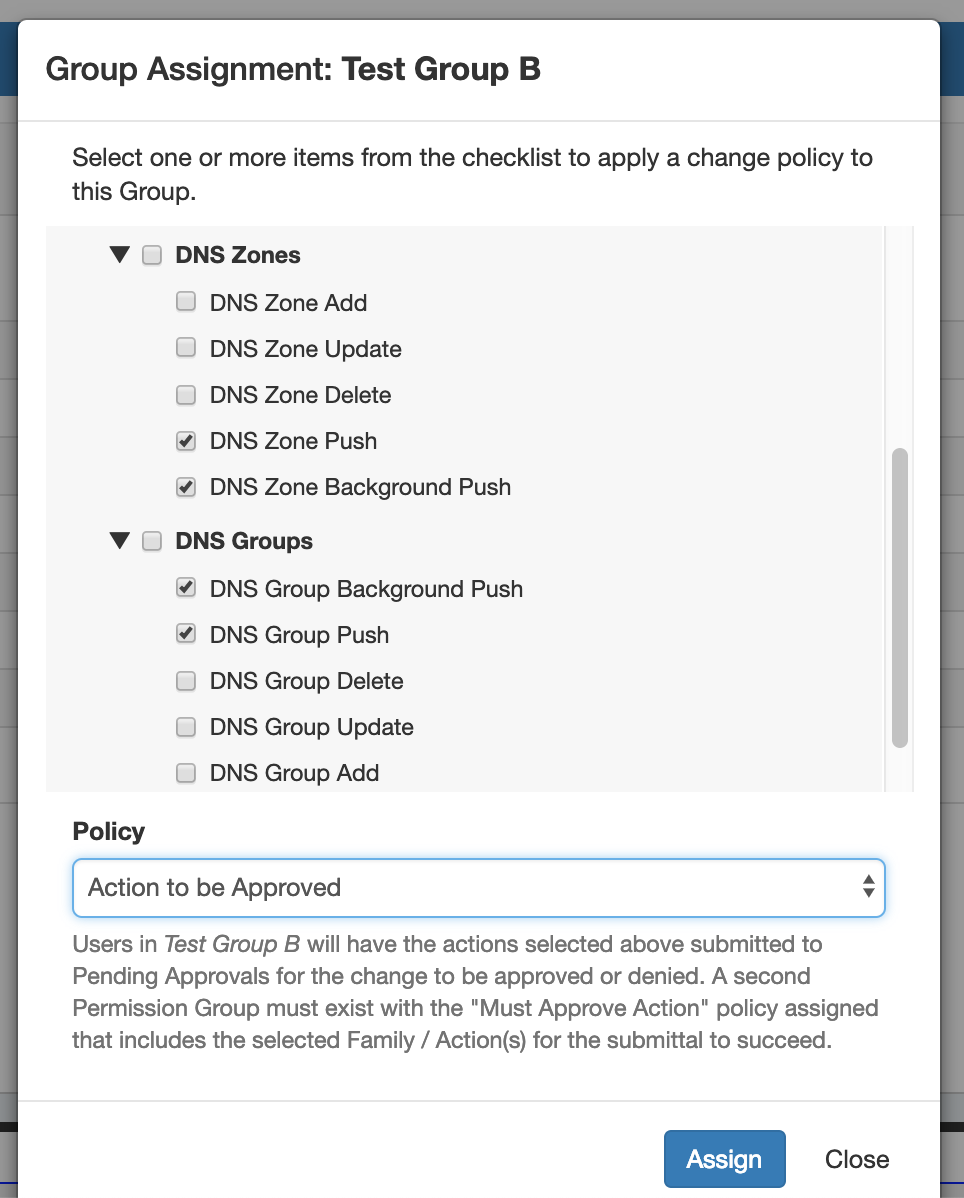 Each type of action can be performed on each family, so when setting up Approval Permission Groups you may choose to set the policy for the entire Family (ex:"All DNS Group actions"), Action (ex:"Add actions for all DNS Families"), or just a specific combination (ex: "Only DNS group Delete").