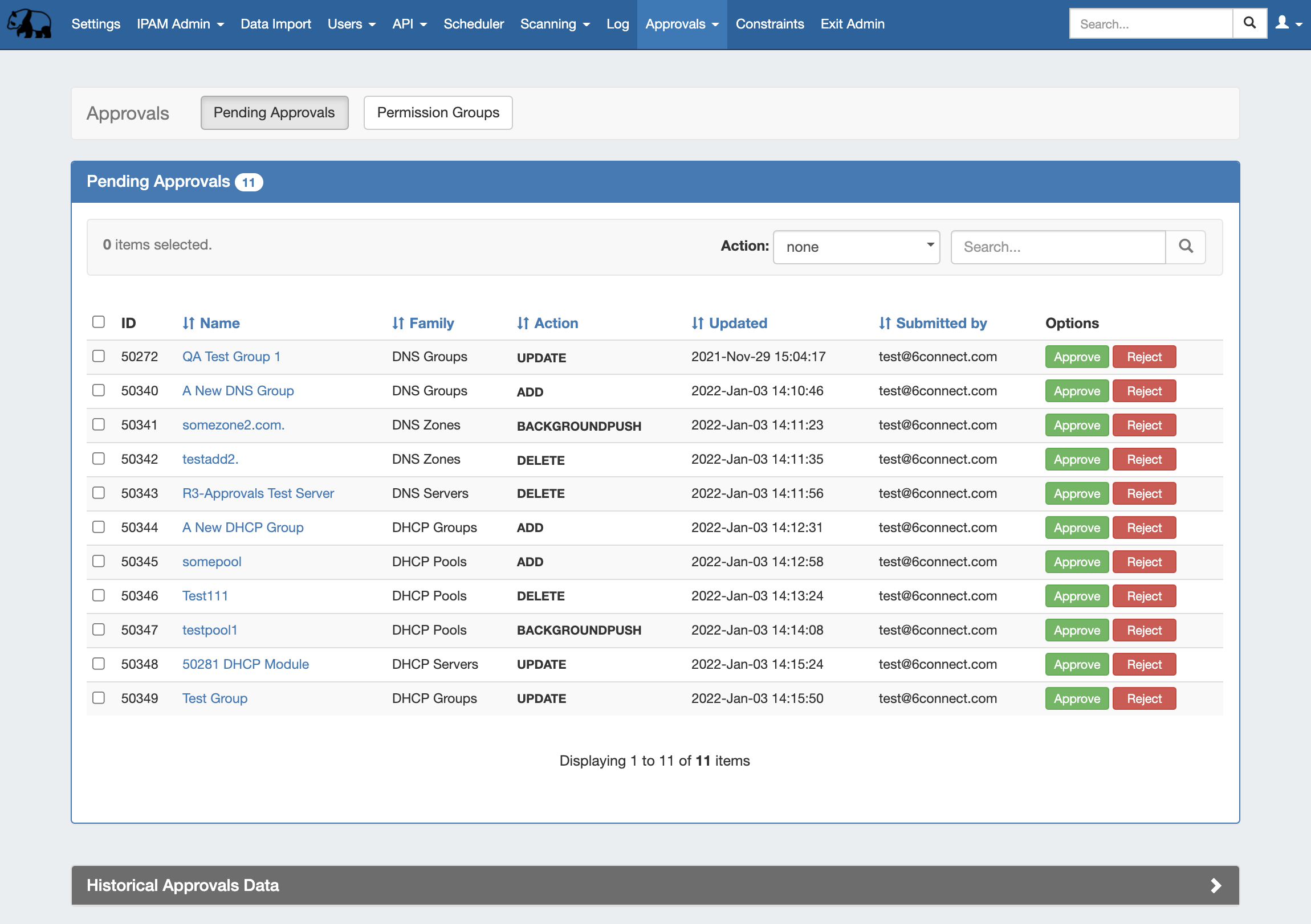 Currently, Approvals is available only for DNS and DHCP related actions. If you are interested in providing feedback, a use case, or requests for future additions to the Approvals system, please contact feedback@6connect.com.