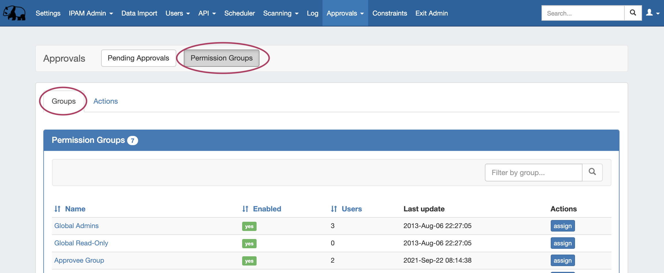 From the Approvals Tab, navigate to the Permission Groups sub-tab Groups page tab: