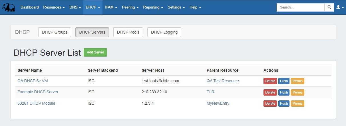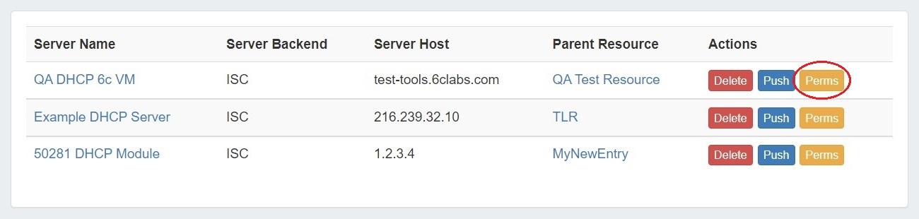 To open the Change Resource Permissions module, click on the "Perms" Button for any DHCP server.