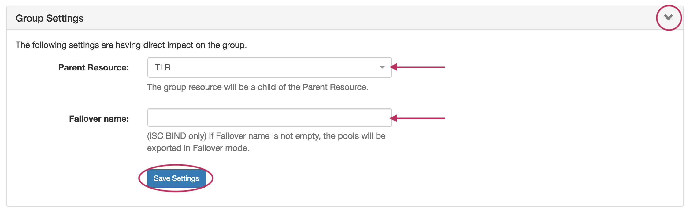 17) Group Settings: Click on the header title or >  to expand or collapse. Edit default group settings including the Parent Resource and Failover name.