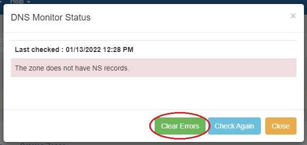 You may clear the error if desired, recheck, or close the box. Clicking the "Clear Errors" button allows you to choose whether to clear the zone error only or the zone error and any errors in records in the zone.