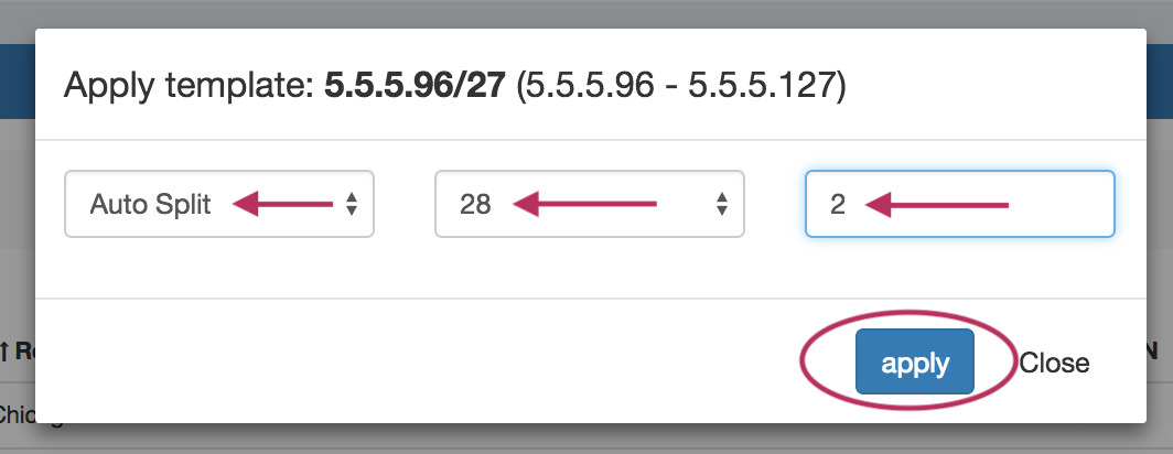 • Split: Splits the selected single block into two equal smaller blocks, of the next smallest mask, e.g. a /24 will be split into two /25s. The Split option is not available for blocks that are already of the smallest available size ( IPv4 /32s or IPv6 /128s), for blocks in "Holding", or for blocks that are already assigned and do not have subassignments enabled. If more than one level of splitting is needed, use "Templates - Auto Split" instead.