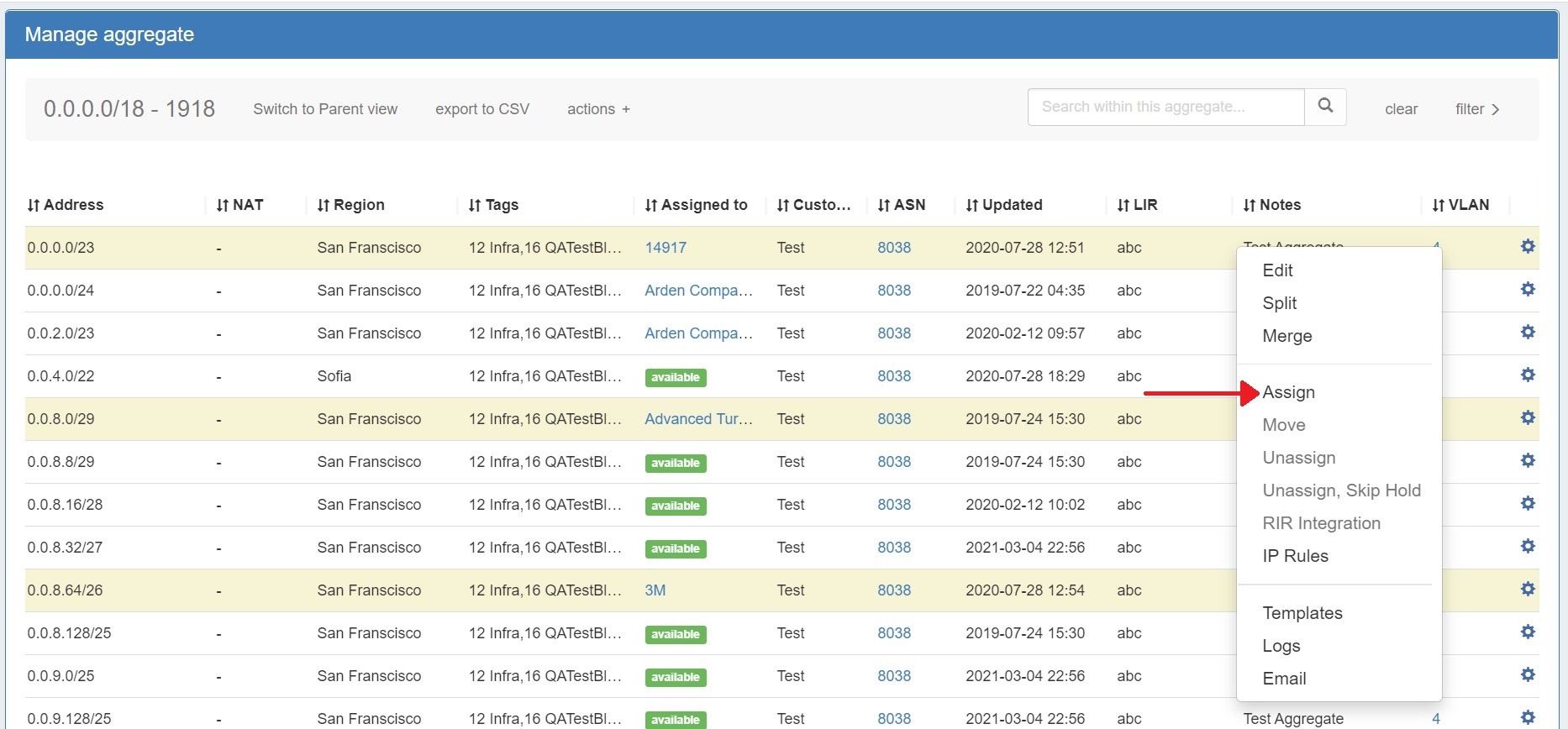 You can also assign blocks manually using the "Assign" function from the IPAM Manager screen (accessible from the IPAM Tab). Open the Action Menu for a block, then select "Assign".