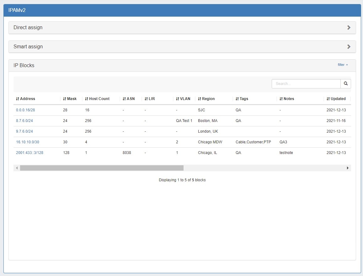 Successful assignments will be added to the "IP Blocks" list in the IPAMv2 Gadget, and are able to be managed in the IPAM Gadget, IPAMv2 Gadget, or IPAM Manage Screen.