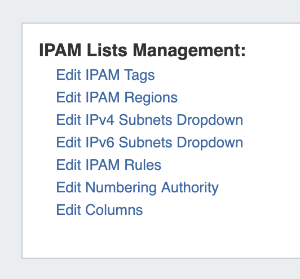 IPAM Rules may be created and applied to blocks under the IPAM Tab -> IPAM Manage screen, in the Action Menu for the desired block. Additional management tasks are available under the IPAM Admin -> "Edit IPAM Rules" page.